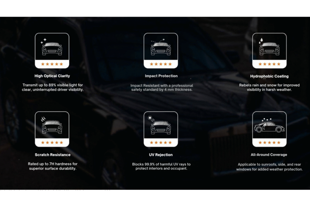 Boudicca’s windshield protection film blocks up to 99.9% of harmful ultraviolet (UV) rays, which not only protects your vehicle’s interior from sun damage and fading but also helps reduce eye strain and fatigue for the driver. This level of UV filtration contributes to a more comfortable and safer driving experience.
